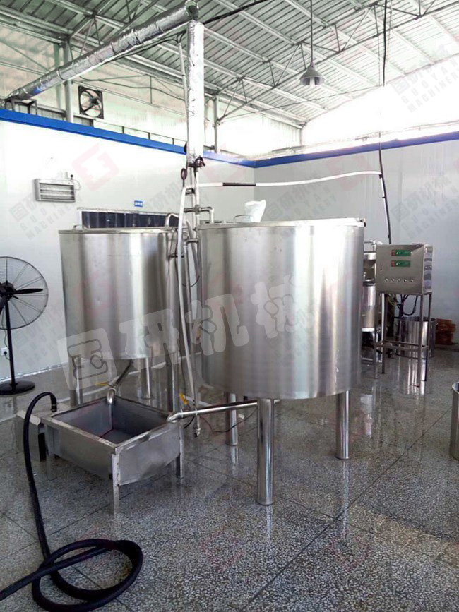 加工豆腐有六道工序:清洗浸泡(夏天4個小時,冬天6個小時,目的是更大限度的確保出漿率)—磨漿分離(傳統工藝需要人工篩漿,而機器是采用漿渣自動分離,減輕了人力,極大提高生產效率)—高溫煮漿(豆漿自動流入煮漿桶,通過蒸汽加熱煮熟)—點漿(豆漿煮開后,再加入凝固劑成型)—壓榨(擠出水份)—成品豆腐。