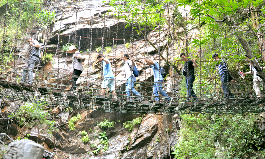 兩小時的小北江之游,大家都還余味未盡。導游又帶上大家趕往這次團建活動的重頭戲的目的地:古龍峽的“云天波霸”。今天公司參加團建的所有員工都要挑戰目前世界上較寬的高空玻璃橋,玻璃橋像一條通體透明的巨龍連接著峽谷兩岸,橋下懸空超過100米,站在橋上向下看,真是令人心驚膽戰,大家相互鼓勵,三三兩兩牽手前行,用相互的關愛順利通過并成功抵達世界較大直徑的懸空玻璃平臺。盡管大家都汗流浹背,但每個人臉上都洋溢著喜悅。因為此時大家都收獲了克服恐懼心理后戰勝困難的勇氣和成功!