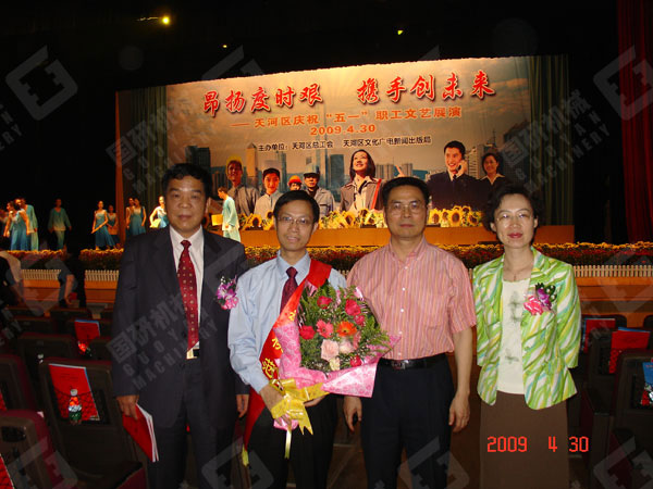 4月28日上午,廣州市委大禮堂張燈結彩、鑼鼓喧天,一派喜氣洋洋。廣州市委、市政府慶祝“五一”國際勞動節暨勞動模范和先進集體表彰大會在這里舉行。廣州市國研機械設備制造有限公司市場部經理劉啟剛同志作為天河區6萬多家民營企業唯一當選的廣州市勞動模范出席了表彰大會。廣東省委常委廣州市委書記朱小丹、市長張廣寧等省市領導親自為劉啟剛等勞動模范頒發廣州市勞動模范獎狀和榮譽證書并合影留念。