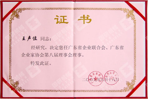 公司董事長兼總經理被授予廣東省企業聯合會、廣東省企業家協會第八屆理事會理事證書