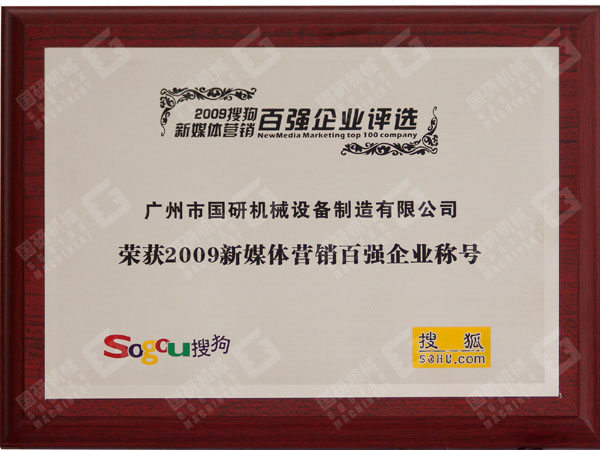 新年伊始,廣州市國研機械設備制造有限公司再度傳來喜訊:在搜狗與搜狐財經、搜狐IT共同舉辦的“2009搜狗新媒體營銷百強企業評選”活動中,廣州市國研機械設備制造有限公司憑借出色的網絡營銷案例成功晉級,與各行業眾多一線品牌企業一同榮獲“2009新媒體營銷百強企業”稱號。